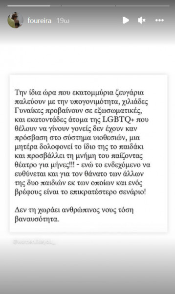 Η Ελένη Φουρέιρα, παρακολουθώντας την υπόθεση έκανε το δικό της story στον προσωπικό της λογαριασμό στο Instagram.