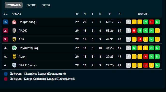 Ο Ολυμπιακός αύξησε κατά έναν βαθμό τη διαφορά του από τον ΠΑΟΚ και πλέον είναι στο +11 – Χαμός για τα ευρωπαϊκά εισιτήρια ανάμεσα σε ΑΕΚ, Παναθηναϊκό και Άρη