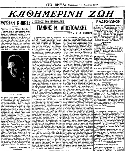 Αυτά έγραφε για την απώλεια του Γιάννη Αποστολάκη ο σπουδαίος Κ. Θ. Δημαράς στο φύλλο της εφημερίδας «Το Βήμα» που είχε κυκλοφορήσει στις 11 Απριλίου 1947.