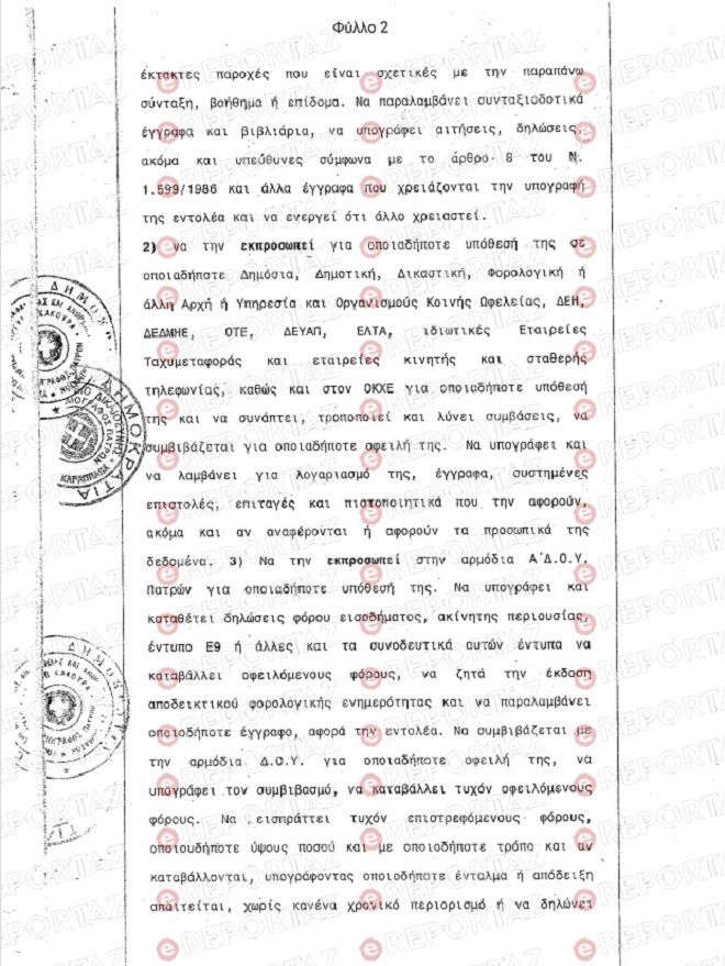 Όπως αναφέρεται στο πληρεξούσιο, ο Μάνος Δασκαλάκης μπορούσε να εισπράτει τη σύνταξη της από την τράπεζα , να κάνει αναλήψεις και καταθέσεις χωρίς περιορισμό, να πληρώνει λογαριασμούς ΔΕΚΟ ,να υπογράφει και να καταθέτει δηλώσεις φόρου εισοδήματος, ακίνητης περιουσίας και να παραλαμβάνει οποιοδήποτε έγγραφο αφορά την εντολέα, καταλήγει το e-reportaz.