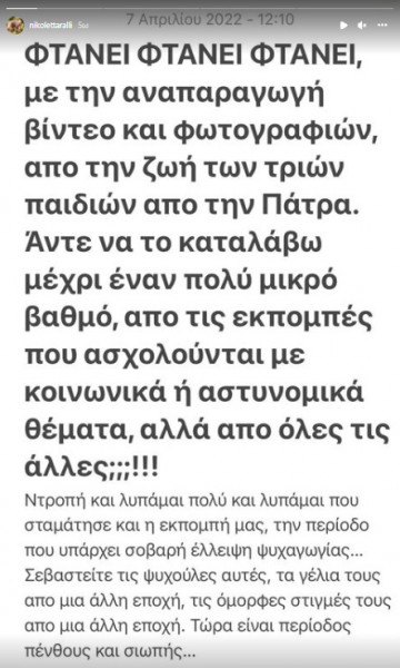 «Φτάνει, φτάνει, φτάνει με την αναπαραγωγή βίντεο και φωτογραφιών από τη ζωή των τριών παιδιών στην Πάτρα. Άντε να το καταλάβω μέχρι έναν πολύ μικρό βαθμό από τις εκπομπές που ασχολούνται με κοινωνικά ή αστυνομικά θέματα, αλλά από όλες τις άλλες;