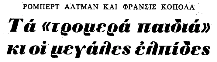 Τον Ιούλιο του 1976, «ΤΟ ΒΗΜΑ» δημοσιεύει κοινή συνέντευξη του Κόπολα και του επίσης σπουδαίου σκηνοθέτη Ρόμπερτ Όλτμαν στη δημοσιογράφο και συγγραφέα Σούζαν Μπρόντι.
