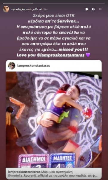 «Σκόρε μου, είσαι ό,τι καλύτερο κέρδισα από το Survivor. Η υπερκόπωση με βάρεσε αλλά πολύ πολύ σύντομα θα επανέλθω να βρεθούμε να σε πάρω αγκαλιά και να σου επιστρέψω το όλο το καλό που έκανε για μένα», έγραψε χαρακτηριστικά.