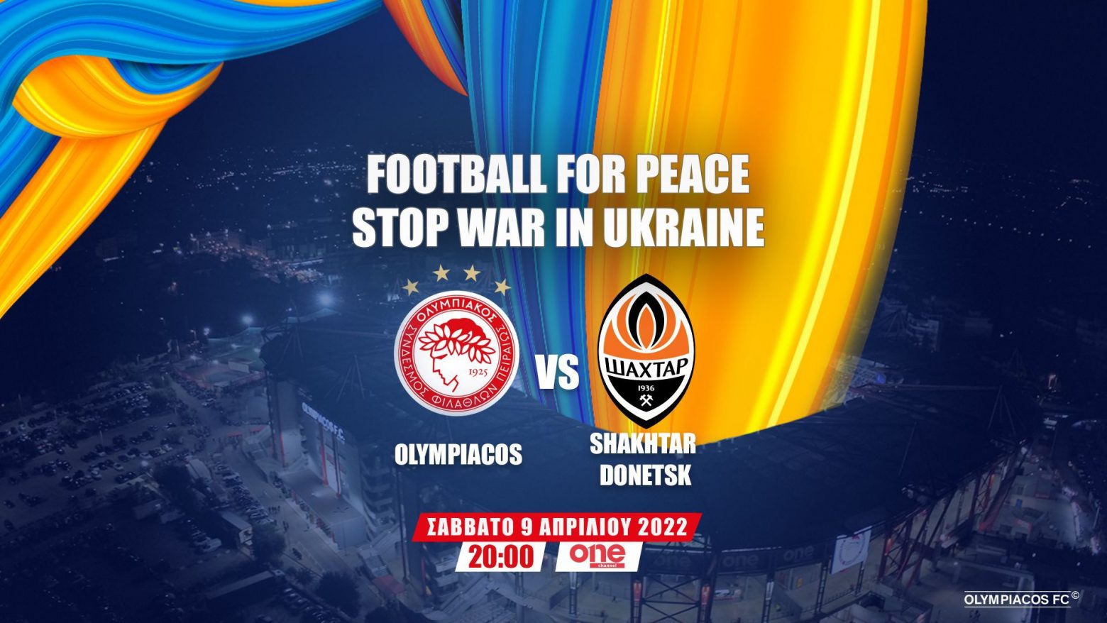 Τον μεγάλο διεθνή φιλικό αγώνα, Ολυμπιακός – Σαχτάρ Ντόνετσκ, για την Ειρήνη και τον τερματισμό του πολέμου θα παρακολουθήσουμε ζωντανά και αποκλειστικά στο ONE Channel, το Σάββατο 9 Απριλίου, στις 20:00.