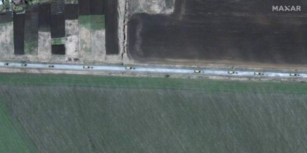 Οι εικόνες, που ελήφθησαν στις 8 Απριλίου, δείχνουν εκατοντάδες τεθωρακισμένα οχήματα φορτηγά με ρυμουλκούμενο πυροβολικό και άλλα στρατιωτικά οχήματα. Το κονβόι καλύπτει μια περιοχή τουλάχιστον 12 χιλιομέτρων και κινείται νότια μέσω της ουκρανικής πόλης Βελίκι Μπουρλούκ.