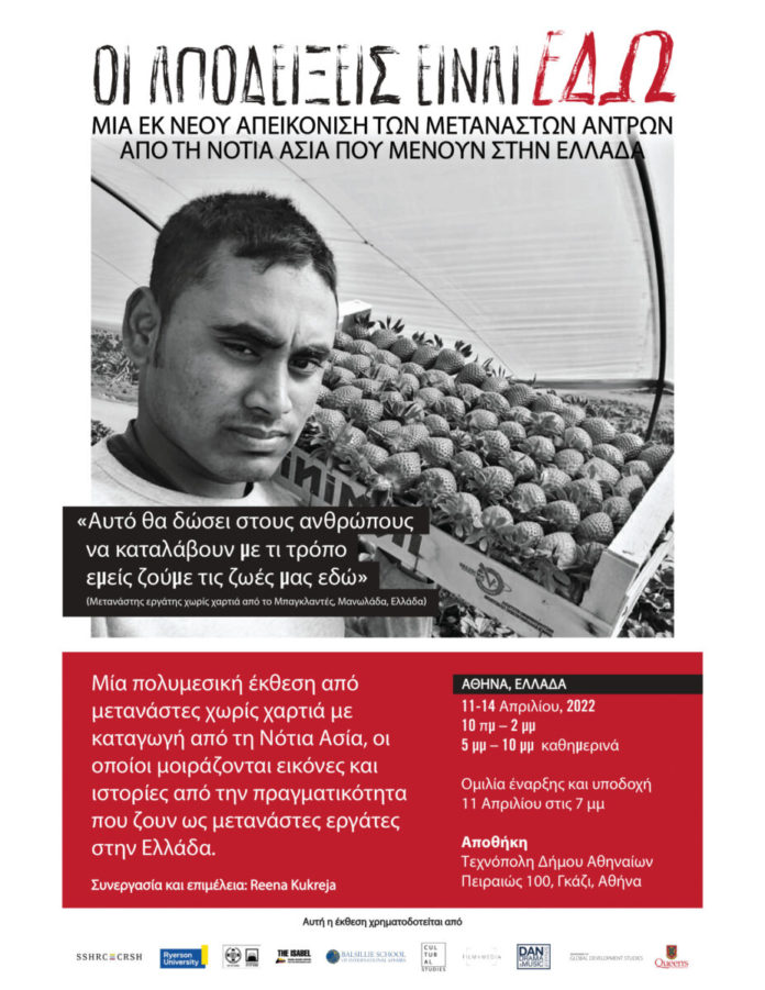 Η έκθεση με τίτλο «Οι αποδείξεις είναι εδώ: Μια εκ νέου απεικόνιση των μεταναστών αντρών από τη Νότια Ασία που μένουν στην Ελλάδα» αποτελεί μια συνεργασία διάρκειας δύο ετών μεταξύ των μεταναστών και της καθηγήτριας του Πανεπιστημίου Queen’s του Καναδά και επιμελήτριας της έκθεσης, Ρίνα Κουκρέγια. Οι μετανάστες χρησιμοποίησαν τα κινητά τους τηλέφωνα για να τραβήξουν εικόνες και βίντεο από την καθημερινότητά τους. Στην έκθεση θα παρουσιαστούν αυτές οι εικόνες, τα βίντεο και αφηγήσεις τους. Επίσης, θα παρουσιαστεί η ανακατασκευή ενός καταλύματος των μεταναστών, σχεδιασμένο και χτισμένο από τους ίδιους ως ένας τρόπος για να δει το κοινό τις σκληρές συνθήκες διαβίωσής τους.