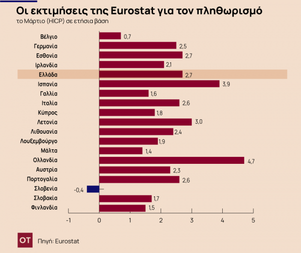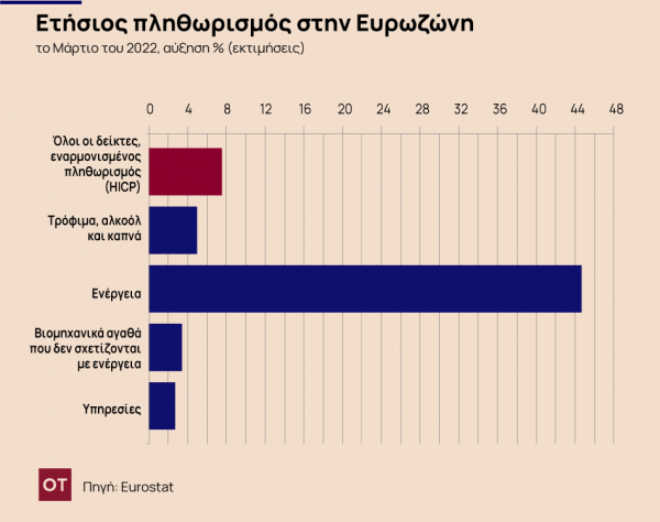 Από την προηγούμενη συνεδρίαση της ΕΚΤ μεσολάβησαν και οι εκτιμήσεις της Eurostat για τον πληθωρισμό του Μαρτίου, ο οποίος εκτινάχθηκε στο 7,5% από 5,9% τον Φεβρουάριο. Η ενέργεια αναμένεται να έχει τον υψηλότερο ετήσιο ρυθμό τον Μάρτιο (44,7%, έναντι 32,0% τον Φεβρουάριο), όπως προκύπτει και από το πάνω διάγραμμα, και ακολουθούν τα τρόφιμα, το αλκοόλ και ο καπνός (5,0%, έναντι 4,2%), μη ενεργειακά βιομηχανικά αγαθά (3,4%, έναντι 3,1%) και υπηρεσίες (2,7%, σε σύγκριση με 2,5%).