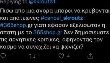 «Το 365shop» το οποίο συνεργαζόταν με την skroutz κατακρατούσε παραγγελίες μηνών και πλέον οι υπεύθυνοι εξαφανίστηκαν. Παρ’ όλο που φαίνεται να είχαν γίνει αρνητικές κριτικές για την skroutz ποτέ δεν τις δημοσίευσε δίνοντας χρόνο στους απατεώνες», καταγγέλλει άλλος παθών.