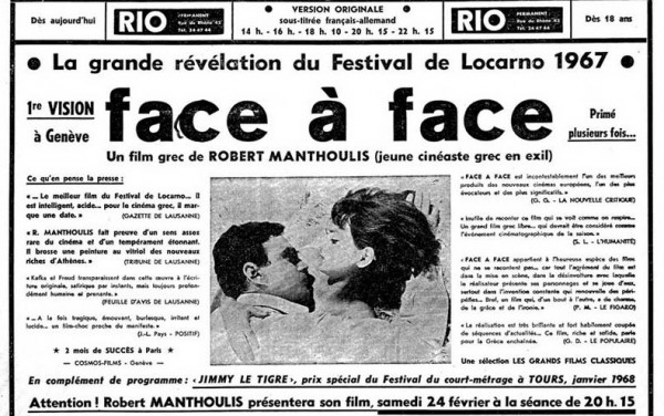 Η ταινία που τον σημάδεψε ήταν το «Πρόσωπο με πρόσωπο» που γύρισε το 1966. Μια καυστική ταινία. Ήταν μια καρικατούρα της αναρριχόμενης νεόπλουτης τάξης των μεγαλοαστών και των κατασκευαστών, που γκρέμιζαν και ασχήμαιναν την Αθήνα. Στην ταινία έπρεπε να σημειωθούν οι δικτατορικές τάσεις που απειλούσαν την πολιτική νομιμότητα και τις ελευθερίες, που με τόσο κόπο μόλις είχαν αρχίσει να επιστρέφουν στην Ελλάδα.