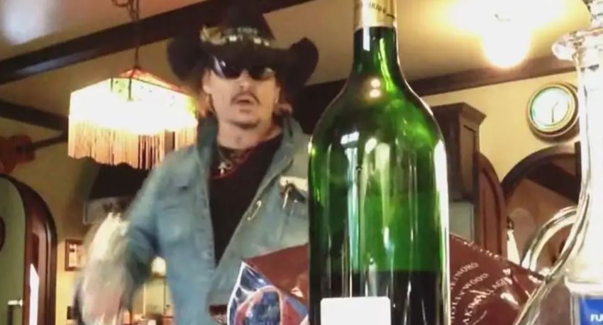 Σε άλλο σημείο του βίντεο βλέπουμε τον χολιγουντιανό σταρ να παίρνει ένα μπουκάλι κρασί, να γεμίζει ένα ποτήρι και στη συνέχεια να το σπάει.