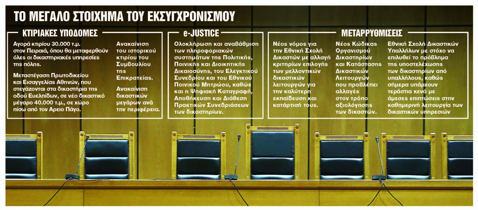 Σε τροχιά σημαντικών αλλαγών και εκσυγχρονισμού με όχημα το Ταμείο Ανάκαμψης και στόχο να αντιμετωπιστούν παθογένειες ετών στον χώρο των δικαστηρίων, με άμεση αντανάκλαση στον πολίτη και στην οικονομία, βρίσκεται το υπουργείο Δικαιοσύνης. Στο πλαίσιο του Εθνικού Σχεδίου Ανάκαμψης και Ανθεκτικότητας, το υπουργείο Δικαιοσύνης, με τον αρμόδιο υπουργό Κώστα Τσιάρα, έχει ήδη εντάξει μια σειρά από έργα που αφορούν χωροταξική αναβάθμιση κομβικής σημασίας δικαστικών υπηρεσιών, καθώς και μεταρρυθμίσεις – περιλαμβανομένης και της εισαγωγής στη χώρα μας του θεσμού της e-δίκης – συνολικού προϋπολογισμού άνω των 250 εκατομμυρίων ευρώ. Το στοίχημα της πολιτείας για τις αλλαγές σε πολλά επίπεδα στον χώρο της Δικαιοσύνης είναι μεγάλο, αν αναλογιστεί κανείς ότι η ετήσια δαπάνη του προϋπολογισμού για τον συγκεκριμένο τομέα, πέρα από το μισθολογικό κόστος, δεν ξεπερνά τα 25 εκατομμύρια ευρώ.