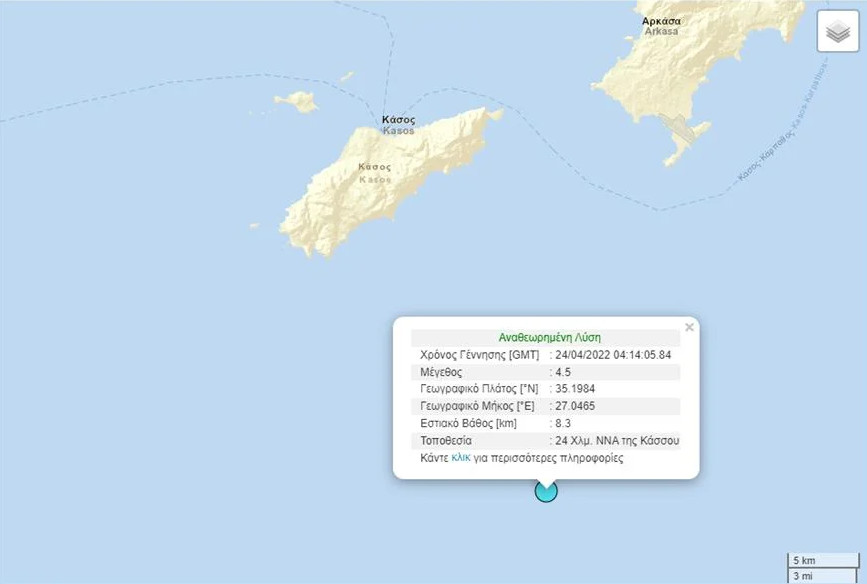 Σεισμός μεγέθους 4,5 βαθμών της κλίμακας Ρίχτερ σημειώθηκε το πρωί της Κυριακής του Πάσχα, ανοιχτά της Κάσου.