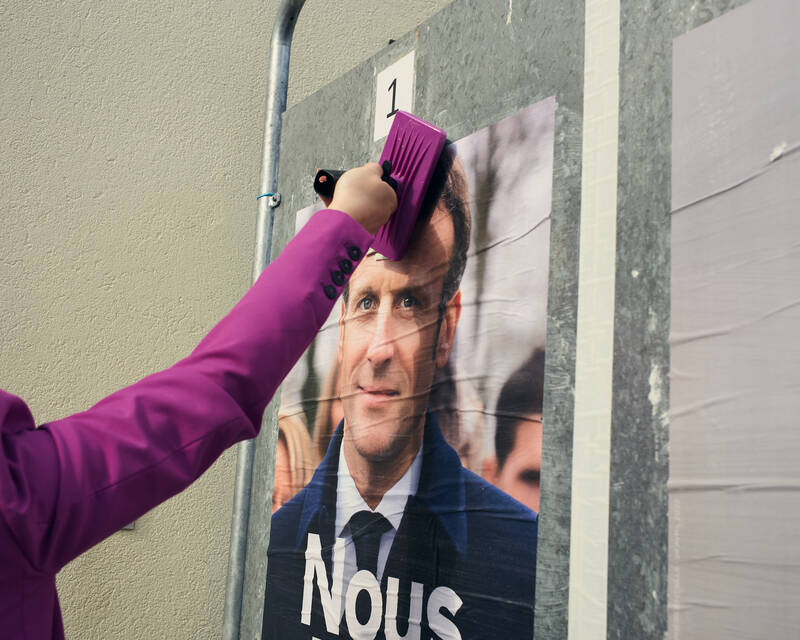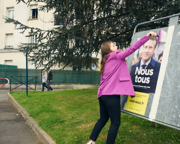 Στο κεφάλι του υποψηφίου υπήρχε ένα αδέξια γραμμένο «σκουπίδια», με μαύρο μαρκαδόρο και στη γραβάτα του ένα «McKinsey». Χωρίς να παρατηρήσει την περιέργεια που προκάλεσε στους περαστικούς στο Domont (Val-d’Oise), η φοιτήτρια πολιτικών επιστημών μουρμούρισε: «Είχαμε πολλές αναφορές στη McKinsey για τις αφίσες, προσβολές επίσης, ή απλά ανθρώπους που έσκιζαν τα πάντα. Μόλις οι προσβολές καλύφθηκαν, επέστρεψε στο αυτοκίνητό της και πέταξε το πινέλο της σε έναν κάδο απορριμμάτων- ροζ, φυσικά.