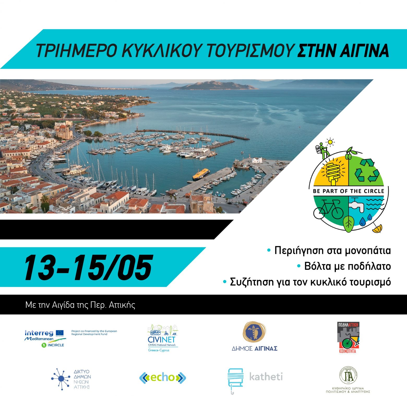 Το Δίκτυο CIVINET Greece – Cyprus μαζί με τον Δήμο Αίγινας και μια σειρά από τοπικούς φορείς της Περιφερειακής Ενότητας Νήσων Αττικής, και υπό την αιγίδα της Περιφέρειας Αττικής, σας προσκαλεί σε ένα τριήμερο δράσεων αφιερωμένο στον κυκλικό τουρισμό που θα πραγματοποιηθεί στις 13-15 Μαΐου 2022 στο νησί της Αίγινας.