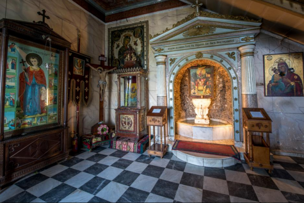 Σε μικρό σπήλαιο εντός του βράχου, χαμηλότερα από το ναό, βρισκόταν κατά την παράδοση το ασκητήριο του ναυαγού που βρήκε την εικόνα της Παναγίας.
