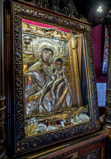 Στο εσωτερικό του ναού με τον εξαίρετο ξυλόγλυπτο διάκοσμο δεσπόζουσα θέση κατέχει η εικόνα της Παναγίας Βρεφοκρατούσας, καθώς και μια σπάνια εικόνα του Αγίου Γεωργίου, που παριστάνεται πεζός και όχι έφιππος όπως κατά κανόνα.