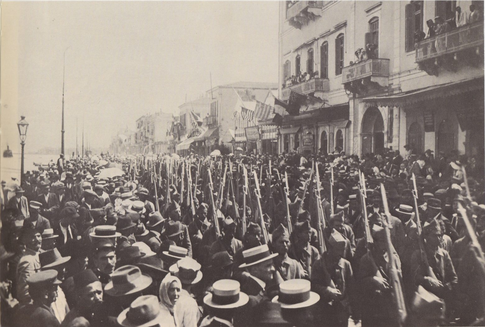 Με το πρώτο γλυκοχάραμα, και ενώ όλη σχεδόν η Σμύρνη είχε καταληφθεί από «εθνική παραφροσύνη», τα ελληνικά οπλιταγωγά άρχισαν να μπαίνουν στο λιμάνι της προαιώνιας ελληνικής πολιτείας και να αποβιβάζουν μέσα σε παραλήρημα χαράς και ενθουσιασμού τα πρώτα τμήματα της «Σιδερένιας Mεραρχίας». Η προκυμαία έσφυζε τώρα από μιλιούνια ανθρώπων. Μικροί και μεγάλοι, κάθε τάξης και φύλου, σπρώχνονταν, ποδοπατούνταν, έδιναν τα χέρια, αγκαλιάζονταν, φιλιούνταν, έλεγαν «Χριστός Ανέστη», κραύγαζαν «Ζήτω η Ελλάς», «Ζήτω ο Βενιζέλος», «Ζήτω η Ελευθερία». Άλλοι τραγουδούσαν τον ελληνικό εθνικό ύμνο κι άλλοι αδημονούσαν να δουν τους Έλληνες στρατιώτες να κατεβαίνουν από τα πολεμικά, να παρατάσσονται εκεί μπροστά, κοντά, δίπλα τους, ώστε, αν άπλωναν τα χέρια, να μπορούσαν να αγγίξουν τις φούντες από τα τσαρούχια, τις φουστανέλες, τα όπλα, όλα όσα τους έφερναν στον νου τον Αγώνα του ’21. «Όλες οι αισθήσεις είχαν γίνει μία» σημειώνει στις πολεμικές ανταποκρίσεις του ο Κώστας Μισαηλίδης, που ήταν παρών σ’ εκείνο το μεθύσι της χαράς, αποκαλώντας «πολεμόχαρους» και «πολεμόχαρο χείμαρρο» τους τσολιάδες του Σταυριανόπουλου που ξεχύθηκαν από το υπερωκεάνιο «Πατρίς», το πρώτο που πλεύρισε στην προκυμαία. Η περιγραφή του είναι συγκλονιστική: