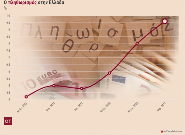 Σύμφωνα με τα στοιχεία της ΕΛΣΤΑΤ ο πληθωρισμός το τελευταίο εξάμηνο (Νοέμβριος 2021 – Απρίλιος 2022) από το 4,2% έχει φτάσει το 9,6% τον Απρίλιο του 2022 (Διάγραμμα).