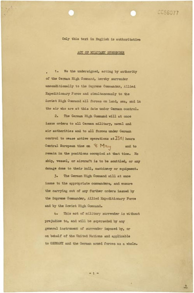 Ο στρατηγός Γιοντλ είχε υπογράψει, εκ μέρους των γερμανικών ενόπλων δυνάμεων, την άνευ όρων παράδοσιν. Το πρακτικόν υπεγράφη περί ώραν 2.41 το πρωί μέσα εις ένα σχολείον που είχε επιταχθεί διά τας ανάγκας του αρχηγείου.
