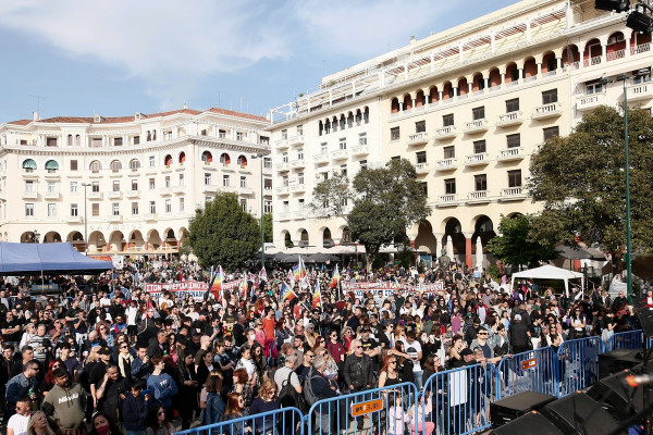 Στην πλατεία Αριστοτέλους, έχουν συγκεντρωθεί φοιτητικοί σύλλογοι, μέλη της εξωκοινοβουλευτικής Αριστεράς και εργατικά σωματεία της πόλης, αναρτώντας πανό και φωνάζοντας να σταματήσει άμεσα ο πόλεμος.