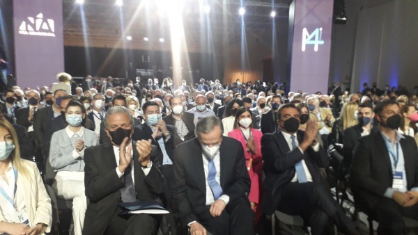 Ο Αντώνης Σαμαράς έφτασε λίγα λεπτά μετά την έναρξη της διαδικασίας την ώρα που προβαλλόταν οι διεθνείς χαιρετισμοί. Εντύπωση προκάλεσε το γεγονός ότι τον συνόδευε πολυπληθής ομάδα του κόμματος, ενώ όταν μπήκε στην αίθουσα κάποιοι σύνεδροι χειροκρότησαν.