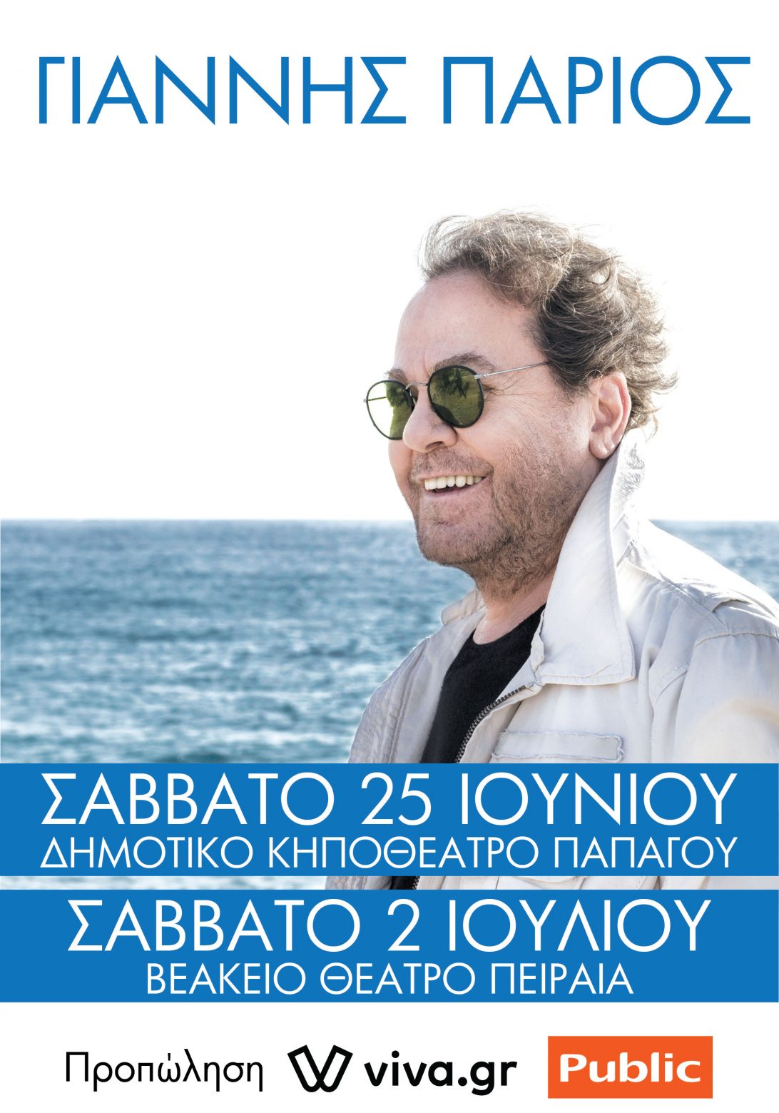 Για πρώτη φορά στο υπέροχο θέατρο του Παπάγου, στις 25/6 και στις 2/7 στον αγαπημένο του Πειραιά, στο Βεάκειο, ο Γιάννης Πάριος θα μας συντροφεύσει σε όμορφα βράδια και θα δημιουργήσει μαζί μας τις πιο όμορφες αναμνήσεις.