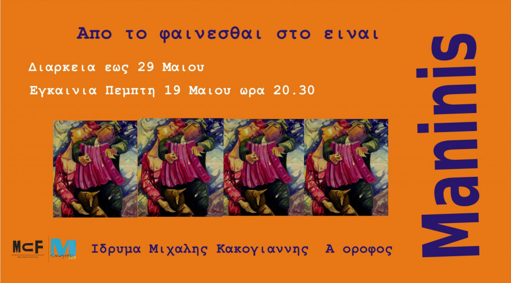 Μια σημαντική έκθεση θα λάβει χώρα την Πέμπτη 19 Μαίου στο Ίδρυμα Μιχάλης Κακογιάννης (τα εγκαίνια στις 20.30). Πρόκειται για την έκθεση του σπουδαίου εικαστικού Δημήτρη Μανίνη ο οποίος θα παρουσιάσει έργα ζωγραφικής και γλυπτά, αντιπροσωπευτικά μισού αιώνα διαδρομής στην εικαστική πράξη.