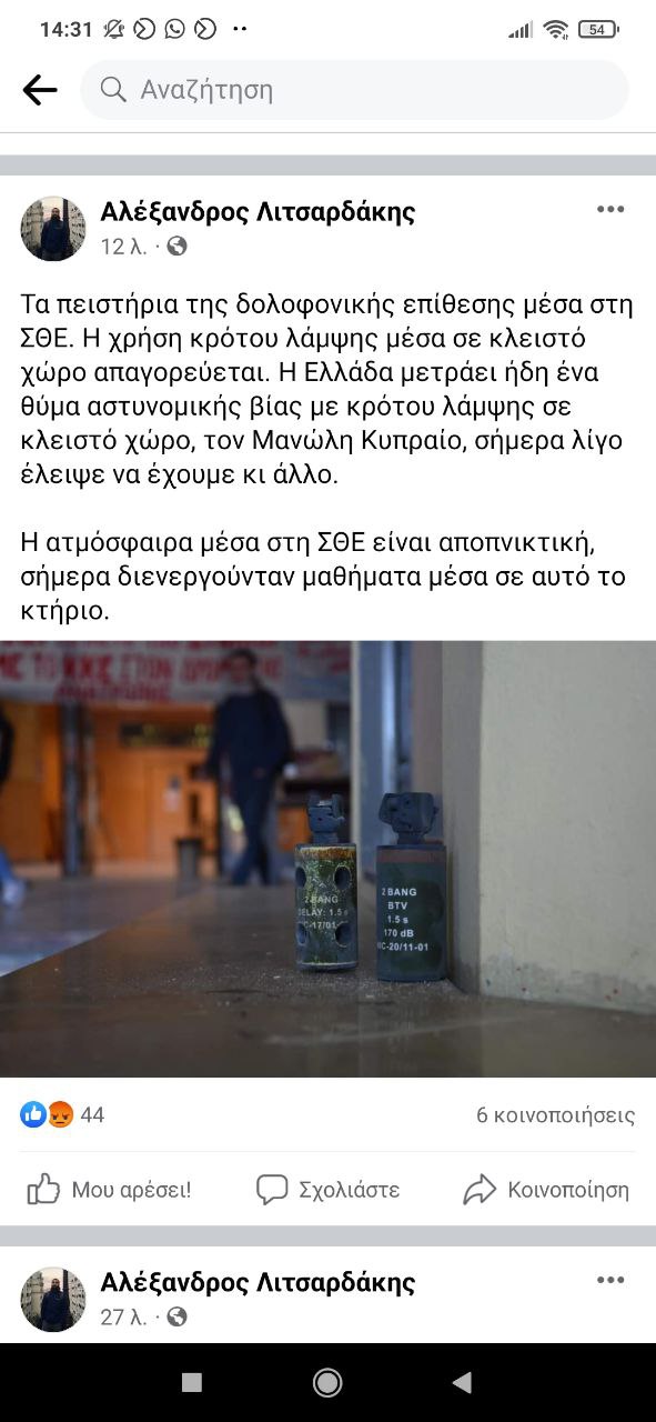 O δημοσιογράφος Αλέξανδρος Λιτσαρδάκης ανέφερε σε ανάρτησή του στο Facebook ότι τα ΜΑΤ έκαναν χρήση κρότου λάμψης σε κλειστό χώρο, κάτι που απαγορεύεται, καθώς μπορεί να υπάρξουν θύματα και πως η ατμόσφαιρα μέσα στο κτίριο της Σχολής Θετικών Επιστημών ήταν αποπνικτική. Ο ίδιος δημοσίευσε μία φωτογραφία όπου φαίνεται η κρότου λάμψης, αλλά και βίντεο από βίαιη σύλληψη ή προσαγωγή.