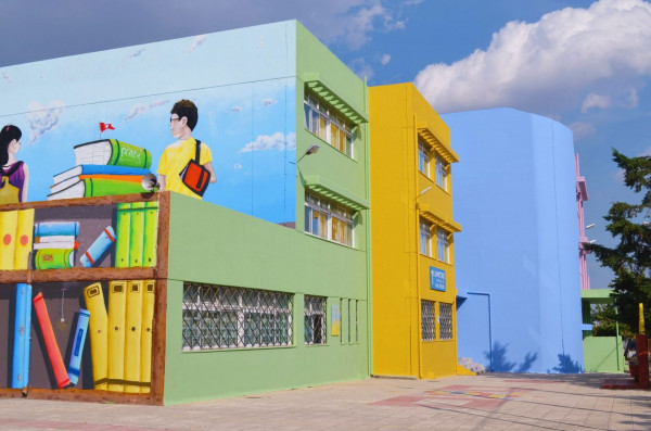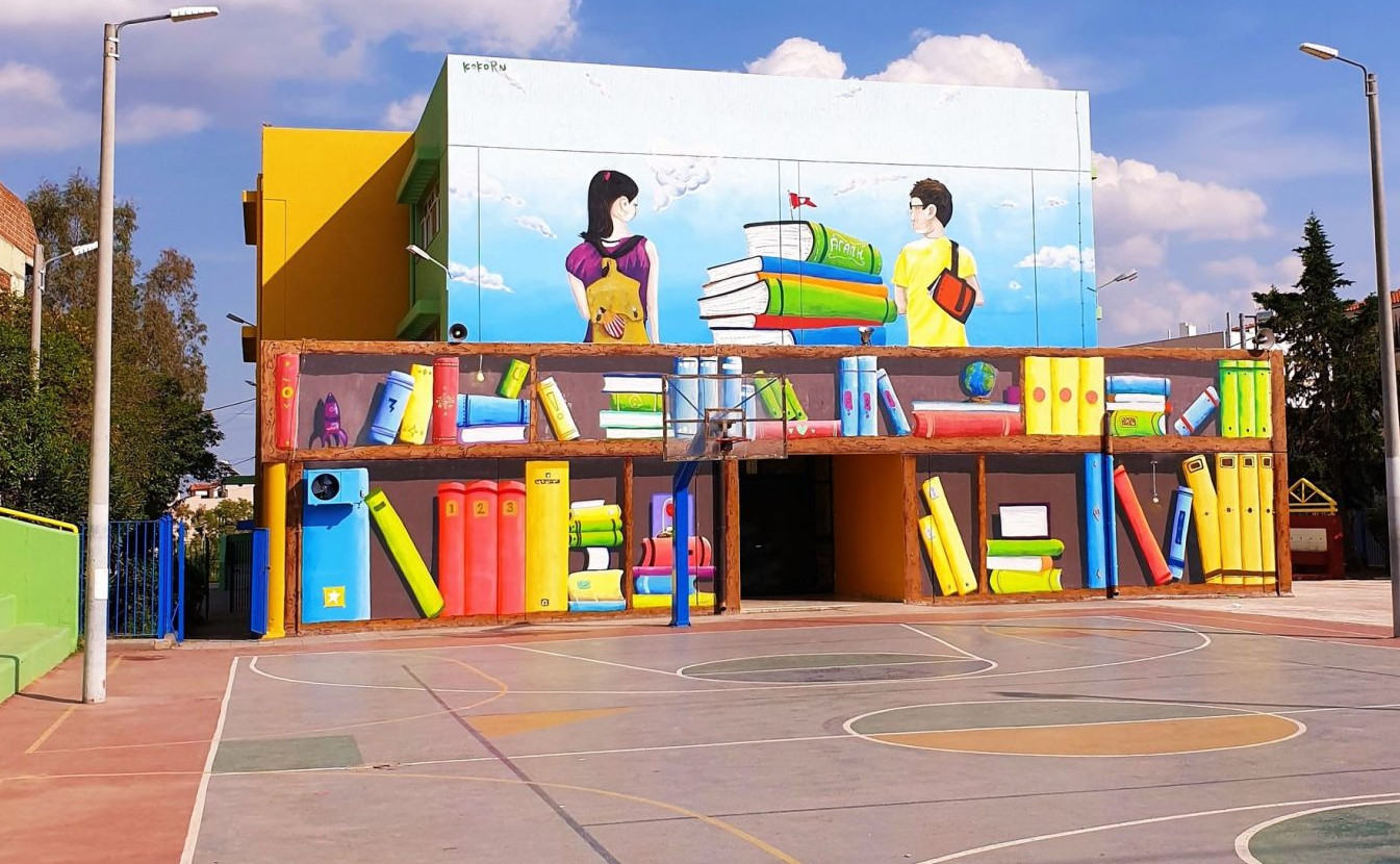 Με ένα, γιγαντιαίων διαστάσεων, διπλό γκράφιτι, που όμοιό του δεν υπάρχει σε άλλο σχολείο και βαμμένο με όμορφα χρώματα από άκρη σε άκρη, το 1ο Δημοτικό Σχολείο Άνω Λιοσίων μετατράπηκε σε στολίδι για να υποδεχθεί τους μαθητές του μετά την δεκαπενθήμερη διακοπή του Πάσχα.