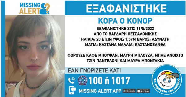 Συγκεκριμένα, στις 11/5/22, εξαφανίστηκε από την περιοχή του Βαρδάρη στην Θεσσαλονίκη η Κόρα Ο Κόνορ, 20 ετών. Το «Χαμόγελο του Παιδιού» ενημερώθηκε για την εξαφάνιση της Κόρα Ο Κόνορ στις 11/5/2022 και προχώρησε στη δημοσιοποίηση των στοιχείων της ενήλικης καθώς συντρέχουν λόγοι οι οποίοι θέτουν τη ζωή της σε κίνδυνο.