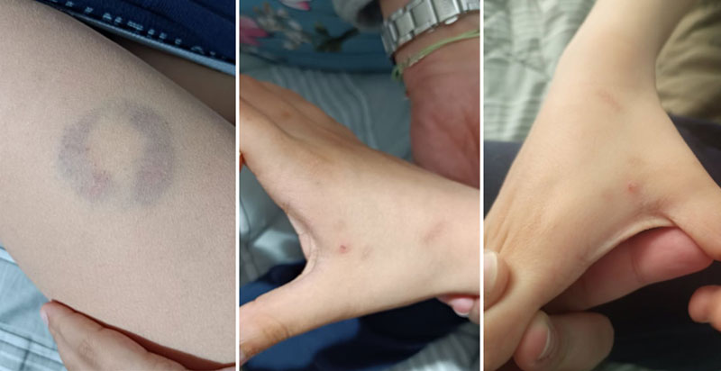 “Την περασμένη Τρίτη, όταν πήγα να πάρω το παιδί μου από το σχολείο, είδα με έκπληξη ότι αυτό έφερε γρατσουνιές πίσω από το δεξί αυτί του και στους καρπούς των χεριών του. Ρώτησα τη δασκάλα του γιου μου τί συνέβη, καθώς το παιδί μου όταν έφυγε το πρωί από το σπίτι μας δεν έφερε κάποιο τραύμα. Η ίδια μου απάντησε ότι τα συγκεκριμένα τραύματα προκλήθηκαν από την προσπάθεια που έκανε η Διευθύντρια και δασκάλα του σχολείου να απομακρύνει από κοντά της το παιδί μου, το οποίο της είχε πιάσει τα μαλλιά της. Η έκπληξή μου συνεχίστηκε όταν έφτασα σπίτι μας και άλλαξα ρούχα στο γιο μου, και πήγα να τον κάνω μπάνιο, όπου εκεί, κατεβάζοντας τη φόρμα του, είδα μια τεράστια μελανιά – δαγκωματιά στο μέσο του ποδιού του, μάλιστα πρόκειται για μια μελανιά όπου φαίνονται ίχνη δοντιών. Αυτό με έκανε αμέσως να καταλάβω ότι κάποιος δάγκωσε το γιο μου δυνατά στο σημείο αυτό.