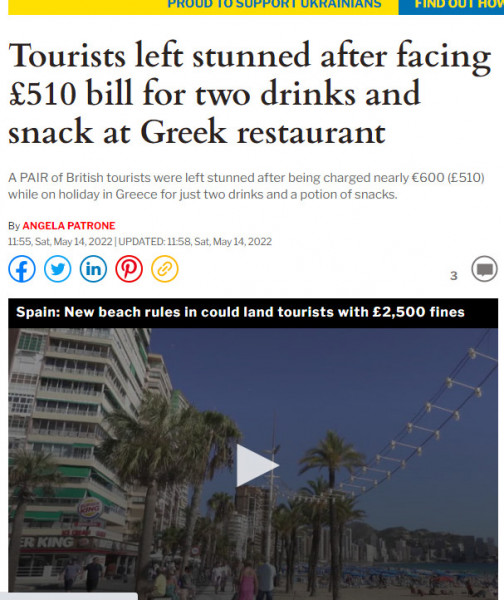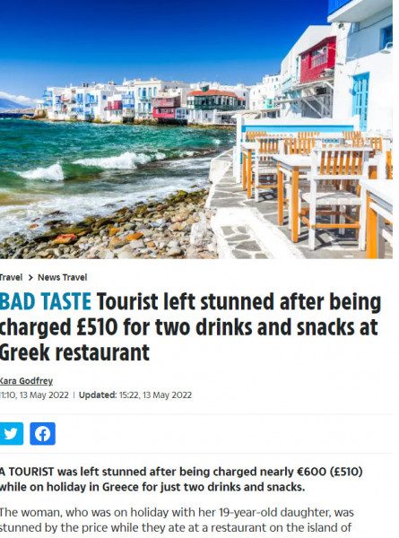Το θέμα σχολίασε και η The Sun, τονίζοντας πως η γυναίκα είπε στον ταξιδιωτικό της πράκτορα: «Περάσαμε μια όμορφη μέρα στην παραλία, αλλά σας παρακαλώ, προειδοποιήστε τους μελλοντικούς σας πελάτες ότι το εστιατόριο-μπαρ που επισκεφτήκαμε, μας χρέωσε 600 ευρώ για δύο κοκτέιλ και μια μερίδα καβουροπόδαρα.