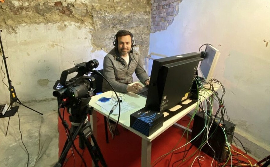 Στο βίντεο ο Μιροσνιτσένκο είναι καθισμένος σε ένα μικρό γραφείο περιτριγυρισμένο από κάμερα, φώτα και πολλά καλώδια.