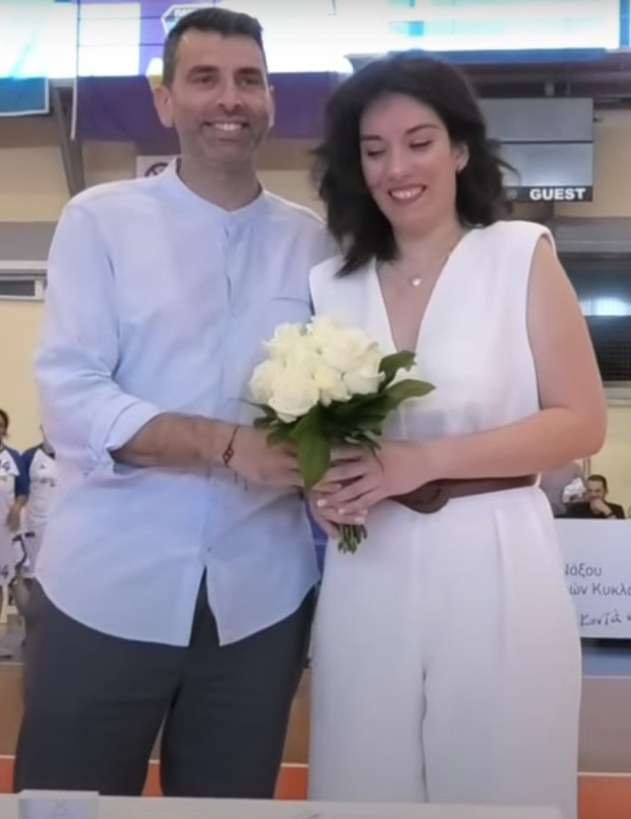 Τον γάμο τέλεσε ο αντιδήμαρχος Βαγγέλης Κατσαράς, παρουσία συγγενών, αθλητριών, φίλων και φιλάθλων συνδυάζοντας αγώνα μπάσκετ και γάμο.