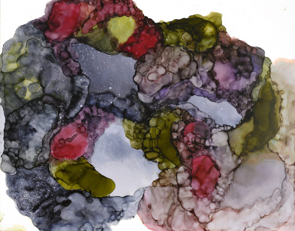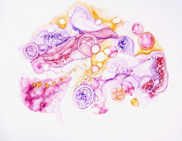 Με υπομονή και ταχύτητα η καλλιτέχνης χρησιμοποιεί κάθε ένα από αυτά και δημιουργεί το εικαστικό πρίσμα που πολλαπλασιάζει τις αρχικές τυχαίες κηλίδες, τις σκηνοθετεί στο χαρτί της και διαμορφώνει ένα ζωγραφικό σύνολο που παραπέμπει στον μαγικό κόσμο της μικροσκοπικής ζωής.