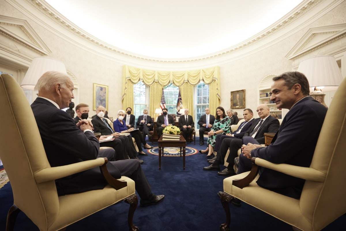 Κατά τον Μητσοτάκη, «δεν καθορίζω τα συμφέροντα της Ελλάδος μέσα από μία άλλη χώρα», που σημαίνει ότι ο Πρωθυπουργός έθεσε στον Λευκό Οίκο το θέμα των «απαράδεκτων» υπερπτήσεων, αλλά σε καμία περίπτωση δεν ήθελε «μονοθεματική» προσέγγιση.