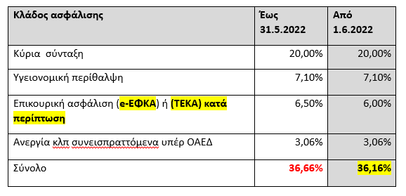 Το συνολικό ποσοστό εισφορών διαμορφώνεται/μειώνεται σε 6% (από 6,50%), επιμεριζόμενο εξίσου (από 3%) σε ασφαλισμένο και εργοδότη. Η εν λόγω μεταβολή αφορά και τους υπαγόμενους στην ασφάλιση του Τ.Ε.Κ.Α.