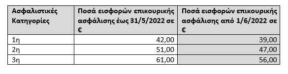 γ) Μη μισθωτούς ασφαλισμένους (Υγειονομικούς – Αυτοαπασχολούμενους και ασφαλισμένους του π. ΟΓΑ) που υπάγονται προαιρετικά στην ασφάλιση του Κλάδου Επικουρικής από 1/1/2021 σύμφωνα με τις διατάξεις του άρθρου 41 του ν. 4670/2020, μειώνονται και ισχύουν από 01.06.2022, ανά ασφαλιστική κατηγορία, ως εξής: