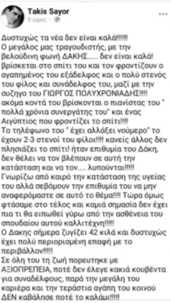 «Δυστυχώς τα νέα δεν είναι καλά!!!!!! Ο μεγάλος μας τραγουδιστής, με την βελούδινη φωνή ΔΑΚΗΣ….. δεν είναι καλά! βρίσκεται στο σπίτι του και τον φροντίζουν ο αγαπημένος του εξάδελφος και ο πολύ στενός του φίλος και συνάδελφος του, μαζί με την σύζυγό του, ΓΙΩΡΓΟΣ ΠΟΛΥΧΡΟΝΙΑΔΗΣ!!!! ακόμα κοντά του βρίσκονται ο πιανίστας του «πολλά χρόνια συνεργάτης του» και ένας Αιγύπτιος που φροντίζει το σπίτι!!!! Το τηλέφωνο του » έχει αλλάξει νούμερο» το έχουν 2-3 στενοί του φίλοι!!!! κανείς άλλος δεν πλησιάζει το σπίτι! ήταν επιθυμία του Δάκη, δεν θέλει να τον βλέπουν σε αυτή την κατάσταση και να τον…. λυπούνται!!!!!