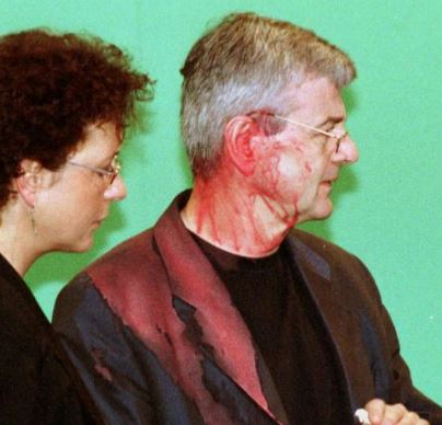 Πριν ανέβει στο βήμα, ένας ακτιβιστής του πέταξε μια σακούλα με κόκκινη μπογιά στο πρόσωπο. Κάποιος από το πλήθος φώναξε: «Στη Γιουγκοσλαβία ρέει αίμα, όχι κέτσαπ!»