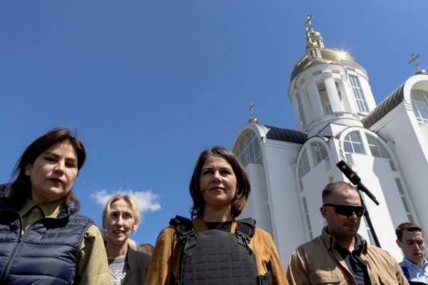Στις επικρίσεις ότι οι παραδόσεις όπλων και ο επανεξοπλισμός της Γερμανίας αποτελούν μεγάλη οπισθοχώρηση για το κόμμα, η Μπέρμποκ αντιτείνει την κόλαση του πολέμου και τα δεινά των Ουκρανών αμάχων από τον αναθεωρητισμό του Πούτιν.