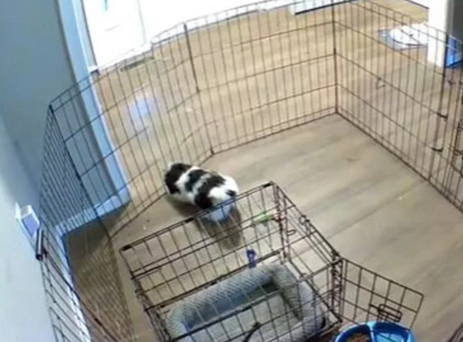 Παρά το γεγονός πως το μεταλλικό πλαίσιο το οποίο έχει τοποθετηθεί για να κρατά τον σκύλο στο συγκεκριμένο μέρος είναι ψηλότερο από το ζώο, μια εσωτερική κάμερα κατέγραψε το κουτάβι την ώρα που καταφέρνει να αποδράσει.