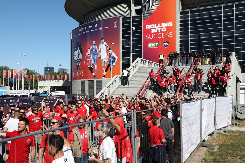 Λίγο μετά τις 17:00, η ερυθρόλευκη αποστολή έφτασε στην Stark Arena, με χιλιάδες οπαδούς να επιφυλάσσουν εντυπωσιακή υποδοχή.