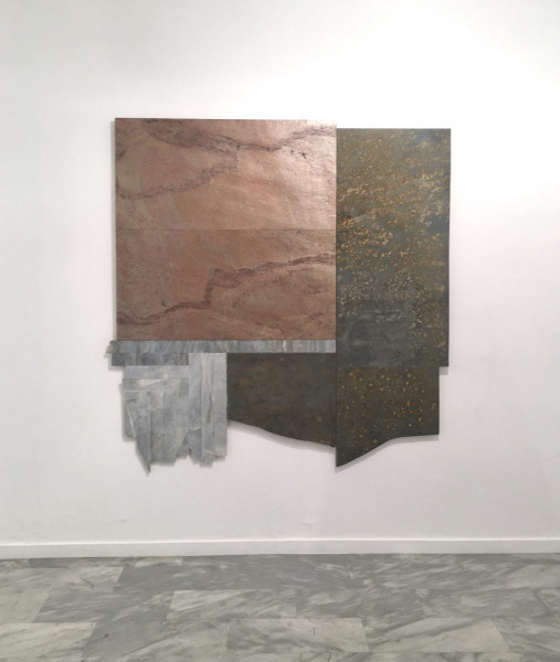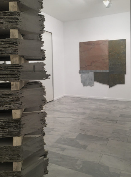 Στο κεντρικό γλυπτό της έκθεσης τον απασχολεί το θέμα της στερέωσης, όπως αυτή εκφράζεται από την προσεκτική σύνδεση μεταξύ χαρτονιού και μαρμάρου. Πρόκειται για μια κατασκευή που βασίζεται στην αλληλεξάρτηση των υλικών και δοκιμάζει τις αντοχές τους· θα μπορούσε να επεκταθεί καθ’ ύψος, έως ότου καταρρεύσει.