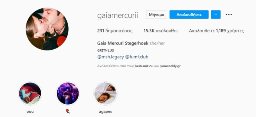 Μάλιστα, για πρώτη φορά, η Γαία αποφάσισε να μοιραστεί με τους διαδικτυακούς της φίλους και μια φωτογραφία που ανταλλάσσει ένα γλυκό φιλί με τον Άγγελο Λάτσιο και συγκεκριμένα βάζοντάς την ως φωτογραφία προφίλ.