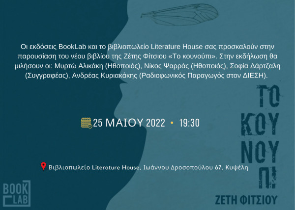 Την Τετάρτη 25 Μαΐου στις 19:30, στο βιβλιοπωλείο Literature House (Ιωάννου Δροσοπούλου 67, Κυψέλη) θα πραγματοποιηθεί η παρουσίαση του νέου βιβλίου της Ζέτης Φίτσιου,