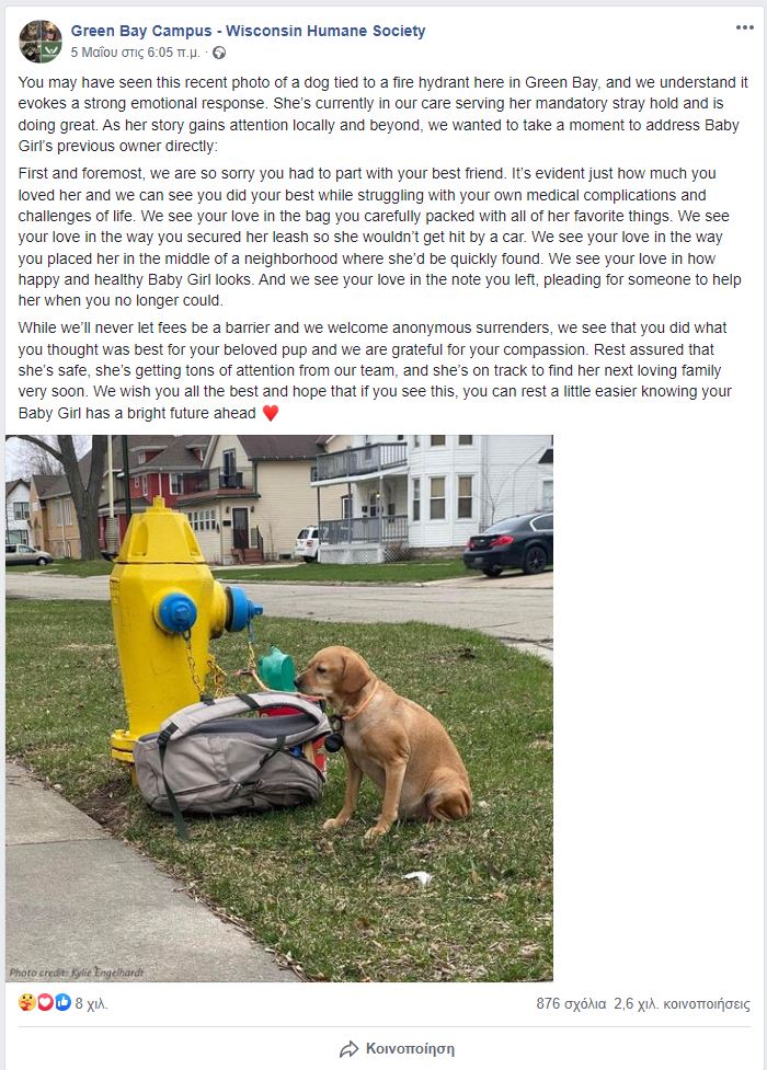 Απευθυνόμενο στον ιδιοκτήτη της Baby Girl, συνέχισε λέγοντας ότι «η τσάντα που μάζεψες προσεκτικά με όλα τα αγαπημένα της πράγματα», «ο τρόπος που ασφάλισες το λουρί της για να μην τη χτυπήσει αυτοκίνητο» και το γεγονός πως την άφησες «σε μια γειτονιάς όπου θα την έβρισκαν γρήγορα, είναι όλα σημάδια ότι την αγαπούσες».