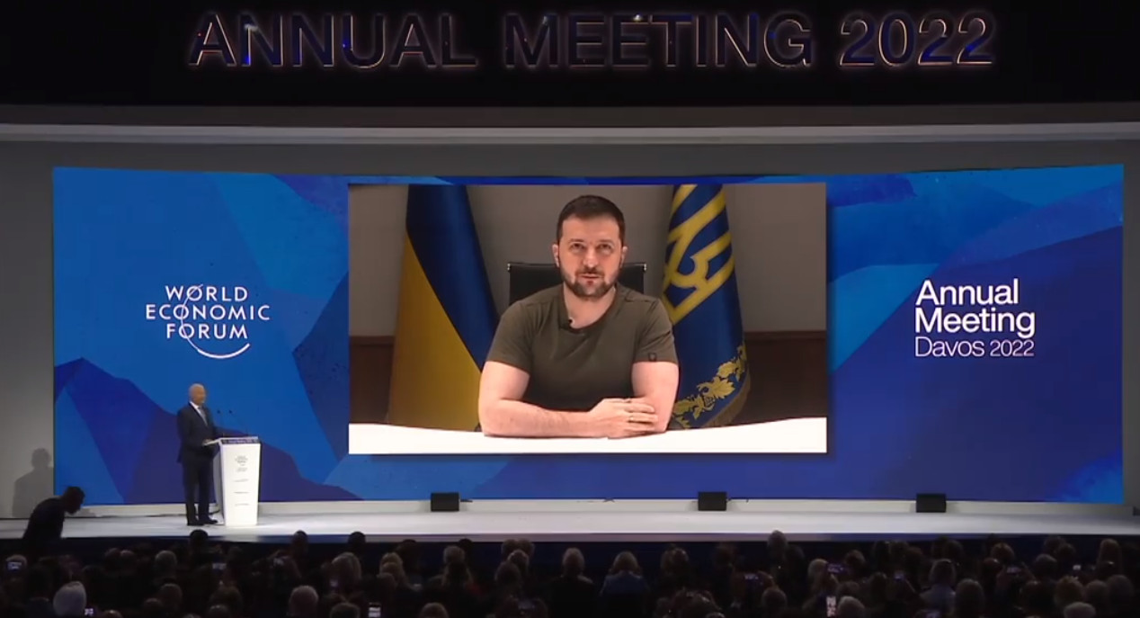 Σε μια βιντεοσκοπημένη ομιλία στο Παγκόσμιο Οικονομικό Φόρουμ (WEF), ο Ζελένσκι ζήτησε πλήρες εμπάργκο πετρελαίου, αποκοπή των ρωσικών τραπεζών από το παγκόσμιο χρηματοπιστωτικό σύστημα, πλήρη απομόνωση του ρωσικού τομέα πληροφορικής και απαγόρευση του εμπορίου με τη Ρωσία.