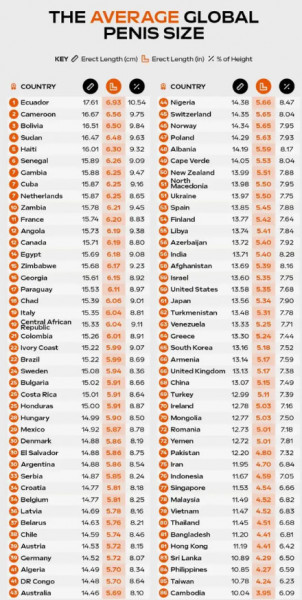 Στην πρώτη θέση καμαρώνει το Εκουαδόρ με μέσο όρο τους 17,61 πόντους σε στύση.