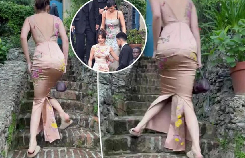 Στο βίντεο που αναρτήθηκε στα social media φαίνεται το μοντέλο να δυσκολεύεται να ανέβει τις σκάλες με το στενό Dolce & Gabbana φόρεμα που επέλεξε για τον γάμο του ζευγαριού.